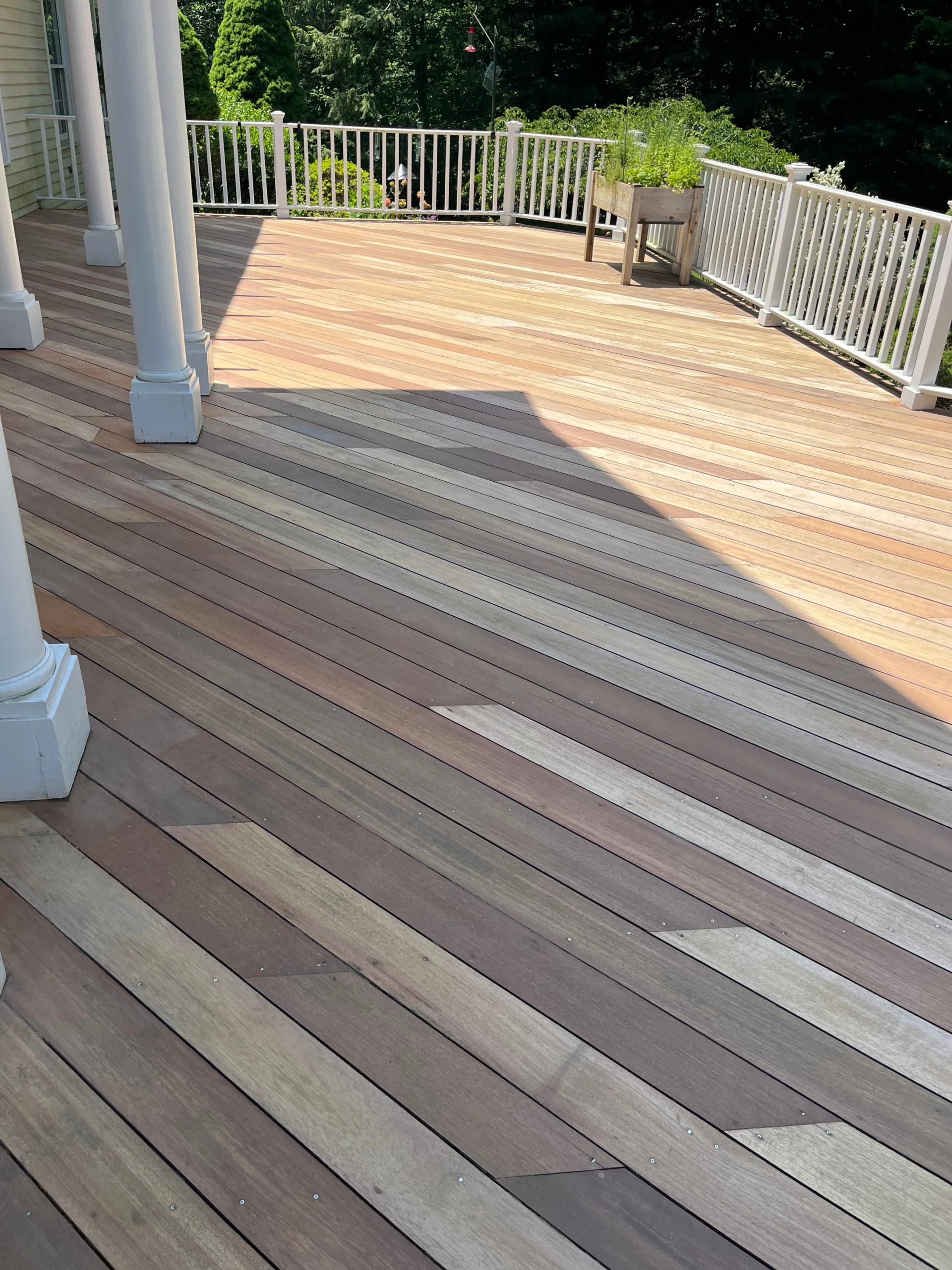 This project involved a comprehensive hardwood deck restoration; first, the surface was thoroughly cleaned to remove dirt and weathering, then carefully sanded to eliminate uneven tones and surface wear. As a result, the natural grain was revealed, and subsequently, a high-quality oil finish was applied to restore color consistency and enhance long-term protection against outdoor elements.