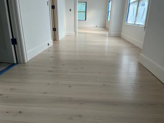 This project focused on a comprehensive white oak floor finishing process within a newly renovated residential space. Initially, the wide-plank boards were sanded to a fine grit to ensure a uniform surface profile and optimal grain clarity. Furthermore, a specialized reactive stain was applied to achieve the muted, neutral tones requested for the design, effectively neutralizing the natural tannins of the wood. Consequently, the application of a high-traffic matte topcoat provided a durable barrier against wear while maintaining the raw, organic appearance of the timber. Ultimately, the work resulted in a sophisticated, balanced finish that enhances the natural light throughout the property.